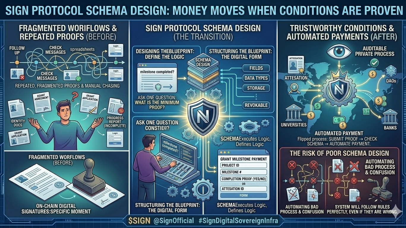 Quando progetto uno schema, il passo più importante per me è porre una semplice domanda: qual è la prova minima richiesta prima che il denaro debba muoversi? Non dati extra, non dieci controlli diversi, solo la condizione che realmente conta. Ad esempio, se si tratta di un pagamento a fondo perduto o a milestone, l'unica cosa che conta davvero è se la milestone è stata completata e se c'è prova. Una volta che questo è chiaramente definito, il resto diventa una struttura tecnica che definisce i campi, i tipi di dati, lo storage e se l'attestazione può essere revocata in seguito se le condizioni cambiano.