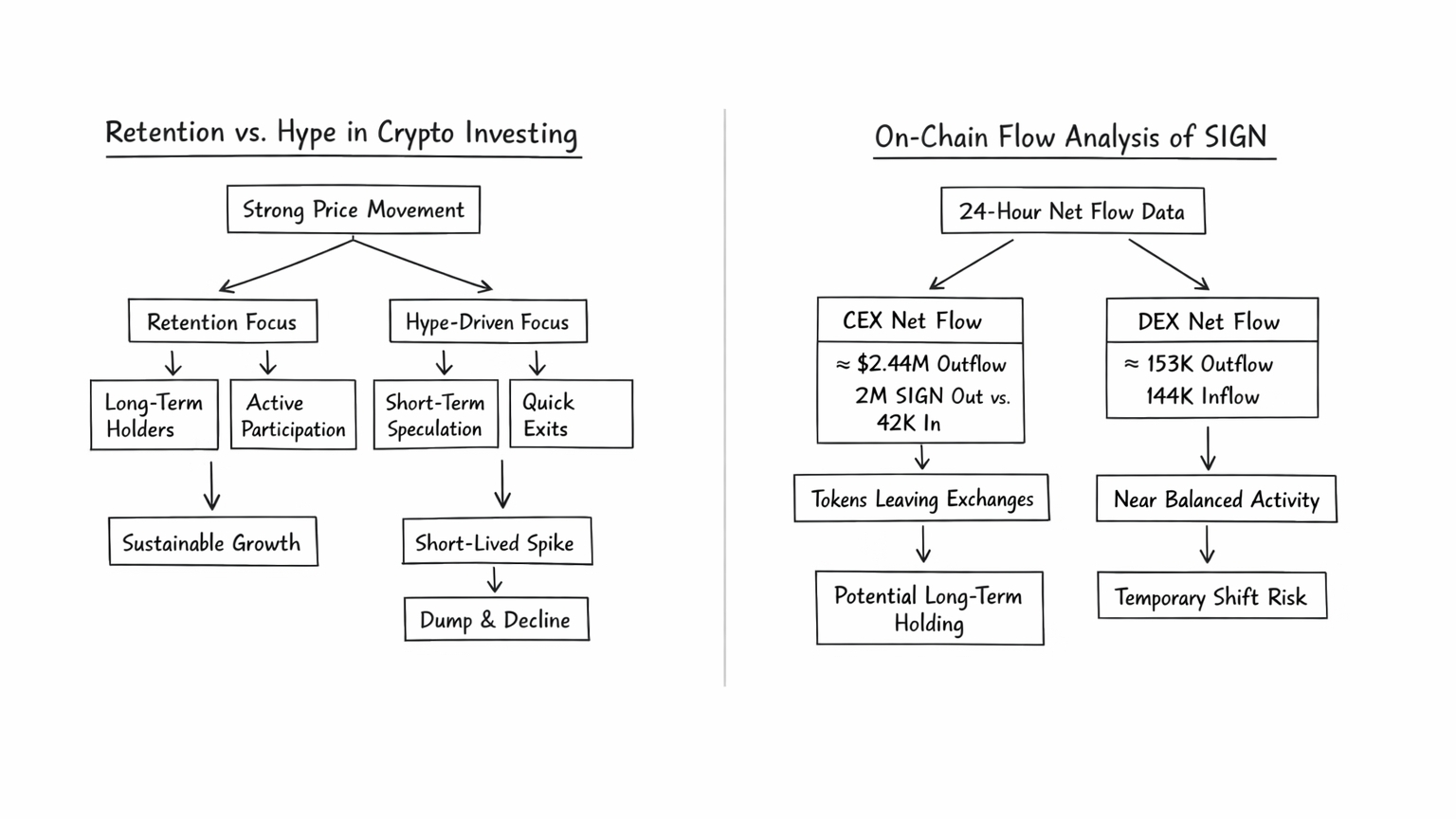 That’s why I keep coming back to the retention problem. Not marketing. Not abstract protocol potential. Retention. The official SIGN site leans into this directly by framing holding SIGN as long term commitment and active participation, not just a passive bet. And today’s coverage around its “Orange Basic Income” program makes that even more concrete: rewards are designed to favor self custody over leaving tokens parked on centralized exchanges. That is not a small detail. It tells you the team knows the weak point. A token can distribute widely, trend for a week, print a nice chart, and still fail the harder test if wallets don’t stick around once the first incentive loop cools off. Here’s the part that makes me cautiously bullish. The on-chain flow data is at least pointing in the direction you’d want to see if retention is improving rather than collapsing. CoinGecko’s holder flow view shows about $2.45 million in negative overall net flow over 24 hours, driven almost entirely by roughly $2.44 million in negative CEX net flow, with around 2 million SIGN flowing out versus just 42,000 flowing in. That usually suggests tokens leaving exchanges faster than they’re arriving, which is often healthier than the opposite if you’re trying to build long term holder behavior instead of constant flip pressure. DEX flow was close to flat by comparison, with about 153,000 out and 144,000 in. Think of it like stock leaving the store shelf and moving into people’s houses. That doesn’t prove they’ll never sell. It does suggest the market structure may be getting a little tighter. Still, this is exactly where the trap case lives too. Retention programs can create the appearance of conviction without creating real loyalty. A wallet that moves coins off exchange for yield is not automatically a committed user. It may just be an opportunist with better storage habits. I’ve seen that movie before. If the incentives are doing all the work, then the second yield compresses or unlock pressure rises, the “community” can suddenly look like a queue at the exit. Even today, some outside commentary has flagged holder concentration as a concern, and while I would not lean on random posts as proof, the issue itself is valid enough to watch closely because concentrated ownership and retention narratives can combine into nasty air pockets when sentiment turns. So my read is this: bullish, but only in a conditional way. I’m not bullish because SIGN is an “infrastructure play” in the abstract. I’m bullish because the market is starting to price in a retention mechanism that might matter, and because the current tape shows strong weekly momentum with serious volume behind it. If a token is up nearly 34% on the week and still pulling net supply off exchanges, that deserves attention. But I’d flip colder fast if self custody stops growing, if volume stays high while price stalls, or if the holder base turns out to be too narrow to absorb future supply. That would tell me the move was more campaign than conviction. For traders, the practical consequence is simple. Don’t just watch the candle. Watch whether retention is becoming behavior or staying an incentive trick. That changes how you size, how long you hold, and whether you treat dips as reloads or warnings. For investors, it’s even more important. Infrastructure tokens live or die on whether people remain involved after the first reason to care passes. SIGN may be one of the more underpriced names in the market if it can turn self custody, governance identity, and post distribution participation into something durable. If it cannot, then this whole setup is just a convincing trap with good branding and a strong week. that’s the trade. Tight, uncomfortable, worth watching. If you’re eyeing $SIGN here, don’t ask only whether it can go higher. Ask whether the holders are actually staying for the right reasons. Are you bullish or bearish from here?