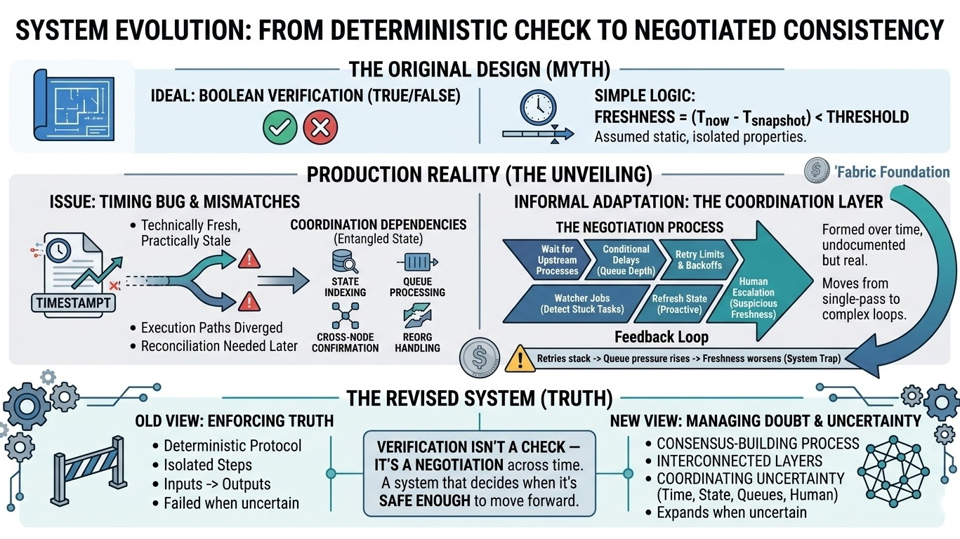 The system assumed that freshness could be measured as a static property. A timestamp compared against “now.” But in reality, freshness depended on multiple asynchronous processes: state indexing, queue processing, cross-node confirmations, and occasional reorg handling.