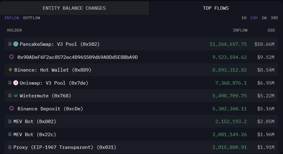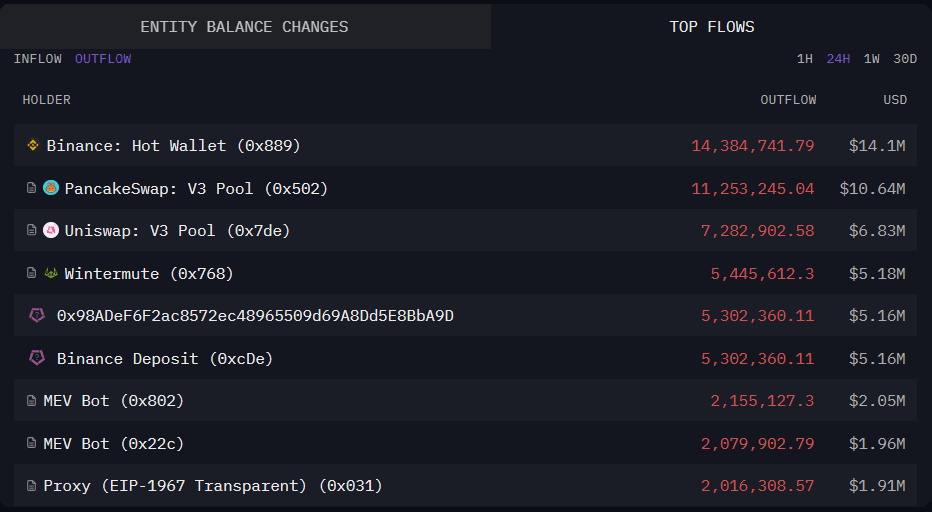 I token che fluiscono verso i “Hot Wallets” o indirizzi di “Deposito” di Binance di solito significano che qualcuno sta inviando token all'exchange per scambiare o detenere. I token che fluiscono FUORI da quei wallet potrebbero significare che qualcuno sta ritirando in un wallet personale (magari per detenere a lungo termine o trasferire su un'altra piattaforma).