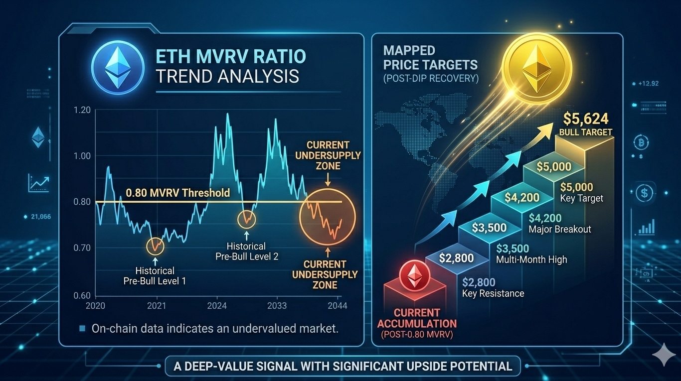 I segnali on-chain stanno lampeggiando una rara "Zona di Acquisto" che gli investitori esperti stavano aspettando. Il rapporto MVRV di Ethereum—una metrica chiave per individuare i minimi di mercato—è sceso sotto 0.8. Storicamente, ogni volta che vediamo questo livello di "sottovalutazione", ha funzionato come la piattaforma di lancio a molla per alcuni dei più leggendari rally rialzisti di ETH.
