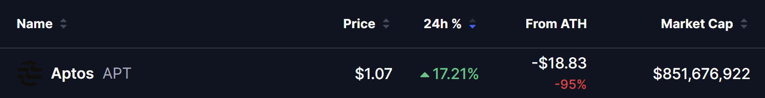 A partire dal 24 marzo 2026, $APT sta negoziando a $1.07, registrando un impressionante guadagno del +17.21% nelle ultime 24 ore, con una capitalizzazione di mercato di circa $851.67 milioni.