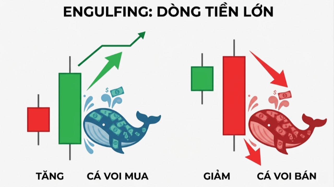 Mô hình Nhấn chìm - Engulfing là bằng chứng trực quan nhất cho thấy sự tham gia của dòng tiền lớn.