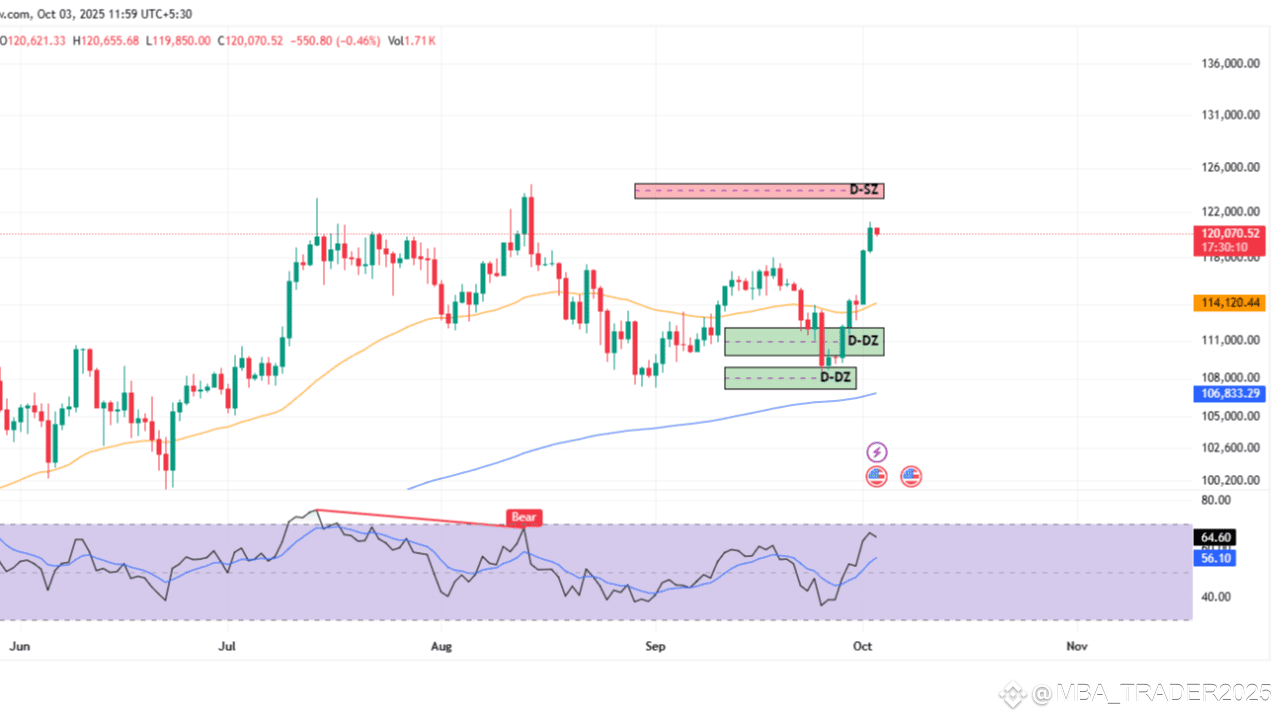 BTC si sta consolidando vicino a 120,1k dopo una corsa verticale da 111,0k–112,0k, con la momentum intraday che si raffredda verso la linea mediana RSI 50; la continuazione richiede di accettare al di sopra di 120,6k–121,0k e mantenere 119,6k–119,2k durante i ritest, mentre una perdita di 118,5k segnala un riempimento più profondo a 117,1k poi 115,7k–115,0k.