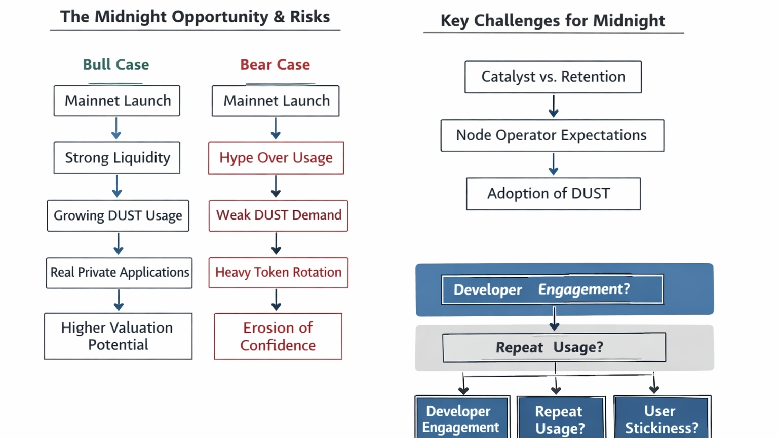 That’s why Midnight is interesting right now. Not just because NIGHT is trading with real attention again, but because the market is starting to price in a version of the story where privacy feels operational instead of dangerous. As of March 24, NIGHT was around $0.049 with a market cap near $815 million, circulating supply around 16.61 billion, and 24 hour volume above $1 billion on Binance pricing. That volume matters because it tells you the market is not ignoring this anymore, even while the token is still well below its December high near $0.118. So the setup is obvious. Price has liquidity, the mainnet milestone is close, and the story is getting easier for people to repeat. But here’s my thesis. Midnight’s opportunity is real, yet the actual risk is older than crypto. It’s the old problem of making risky systems feel safe because the interface got better. In traditional finance, that happens when complexity gets hidden behind good packaging. In crypto, it happens when privacy, compliance, and developer friendliness get bundled into a cleaner narrative than the network has actually earned. Midnight might solve a real need. It also might get over-credited too early because it explains itself so well. If you’re looking at this project, the core thing to understand is simple. Midnight is not trying to be a classic privacy coin where everything disappears into darkness. Its model is selective disclosure. NIGHT itself is public and unshielded, while holding NIGHT generates DUST, which is the shielded network resource used to pay for transactions and smart contract execution. Think of NIGHT as the stake and DUST as the fuel. That split matters because Midnight is trying to separate speculative value from network usage in a way that looks more compliant and more usable for actual applications. Now here’s the thing. That design is smart, but smart design is not the same as proven behavior. Markets love architectures that sound like they resolve a contradiction. In this case, the contradiction is privacy versus regulation. Midnight’s pitch is that you can prove what matters without exposing everything. On paper, that is strong. In practice, I still want to see whether developers, users, and institutions actually build recurring behavior on top of it, or whether they mostly reward the concept. There are reasons the bull case has teeth. Mainnet is officially targeted for late March 2026 as Midnight moves into its Kūkolu phase, and the project has been stacking credibility signals around that transition. Official updates tied the mainnet path to federated node operators including Google Cloud, Blockdaemon, Shielded Technologies, AlphaTON, and later additions like MoneyGram, Pairpoint by Vodafone, and eToro. That doesn’t prove product market fit, but it does show Midnight is trying to reduce launch fragility by surrounding itself with operators that already know how to handle regulated, high volume systems. There is also real distribution behind the token. Midnight says more than 3.5 billion NIGHT were claimed in Glacier Drop by over 170,000 addresses, with Scavenger Mine adding 1 billion more claimed across more than 8 million addresses. That kind of broad distribution helps liquidity and awareness. It gives Midnight a larger base than many privacy-oriented projects ever get. But broad distribution can cut both ways. It can create a wide community, or it can create a wide exit queue. That’s where I think the market might be missing the harder question. Easy tools are good. Easier contract design is good. Midnight has been pushing the idea that developers can work with zero knowledge tooling without living inside cryptography research all day, and the Midnight City simulation was presented as a way to show selective disclosure and scale under more realistic activity patterns. All of that lowers friction. But lower friction can also make people underestimate how hard trust formation still is. A system that makes privacy easier to use can still fail if the usage loop is weak. So what could go wrong? First, mainnet hype may be outrunning evidence of sticky demand. A late March launch is a tradable catalyst, but catalysts are not retention. Second, the dual token model only works if DUST becomes something developers and users repeatedly need, not just something people mention in explainer threads. Third, institutions joining as node operators improves credibility, but it also raises expectations. Once you bring names like MoneyGram or Google Cloud into the orbit, the market stops judging you like an experiment and starts judging you like emerging infrastructure. That’s a tougher standard. My realistic bull case is not some instant moonshot call. It’s that Midnight gets through mainnet cleanly, keeps liquidity strong, and starts proving actual private application usage. If that happens, I think the market can justify revisiting higher valuation bands closer to prior euphoric levels, especially if daily volume stays elevated and the network starts publishing better post-mainnet activity metrics. The bear case is simpler. Mainnet arrives, the story stays louder than usage, and NIGHT keeps behaving like a narrative asset with heavy rotation and weak retention. In that setup, the old high becomes less important than the fact the token is still down materially from it despite all the story support. What I’ll be tracking is not just price. I want to see whether Midnight starts showing evidence of recurring transactions, developer deployment quality, and real demand for DUST-driven execution. I want to see whether privacy on Midnight becomes something people return to because it solves an operational problem, not because it sounds intelligent in a market starving for the next polished thesis. That’s the bigger picture for me. Midnight might be building exactly what this market needs next. But the danger is familiar. The easier a risky system feels to use, the easier it becomes f