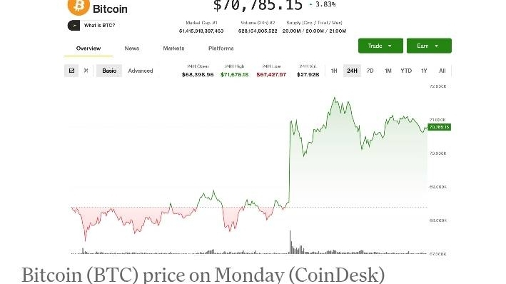Il Bitcoin è salito sopra $70.000 e ha mantenuto la maggior parte dei suoi guadagni dopo che il presidente degli Stati Uniti Donald Trump ha annunciato una pausa di cinque giorni sugli attacchi contro le infrastrutture energetiche iraniane.
