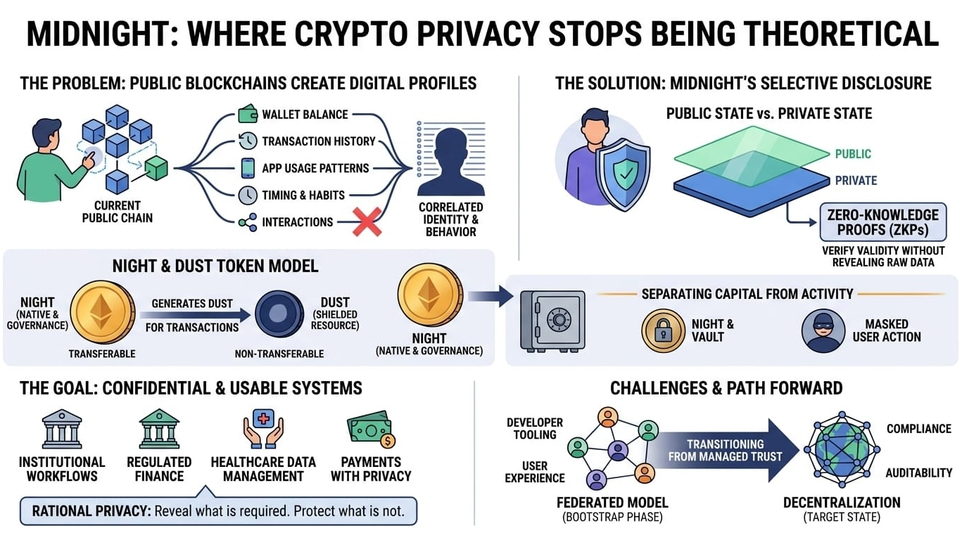 For a long time, privacy in crypto has been discussed like an abstract principle, something people nod at in theory but rarely confront in practice. Everyone says it matters, but most of the time they still build on systems where every action leaves a trail so detailed that using the network almost feels like publishing a diary in real time. That is what makes Midnight interesting. It does not approach privacy like a decorative extra or a philosophical luxury. It starts from a much more uncomfortable observation: on most blockchains, the leak begins the moment you use them exactly as they were designed to be used.
