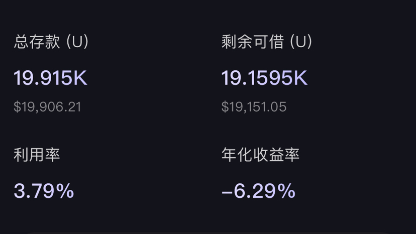 Depositi totali 19.915K U, prestiti rimanenti 19.1595K U, il tasso di utilizzo è solo del 3,79%, ma si stanno verificando evidenti rendimenti negativi.
