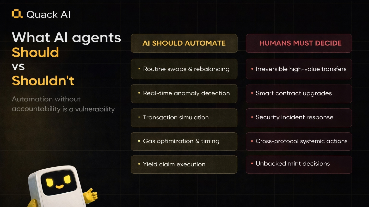 Tuttavia, azioni critiche come trasferimenti di alto valore, aggiornamenti di contratti intelligenti e risposte di sicurezza devono rimanere nelle mani degli esseri umani.