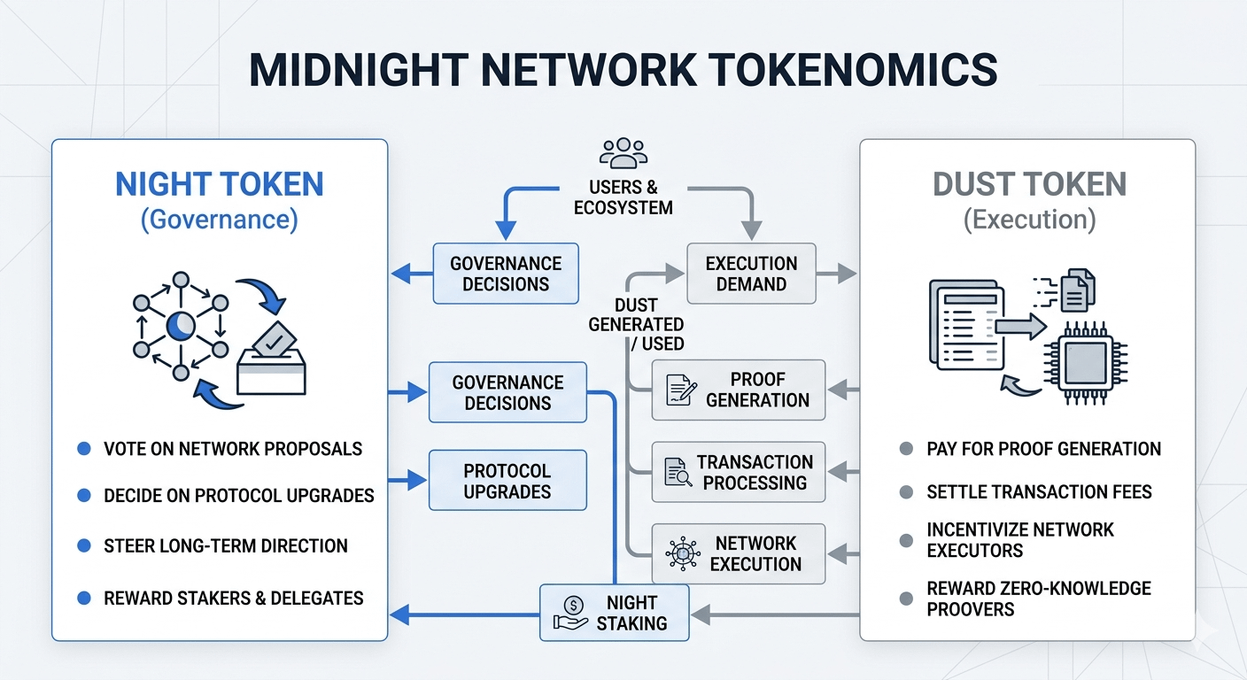 The network tokenomics reflect deliberate design NIGHT the governance token empowers the community to guide protocol development while DUST the execution token handles computational proof generation and transaction processing By separating governance from execution Midnight Network ensures system stability and scalability preventing risks of token conflation seen in other networks.