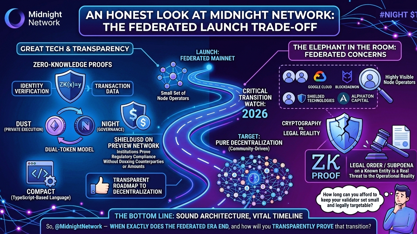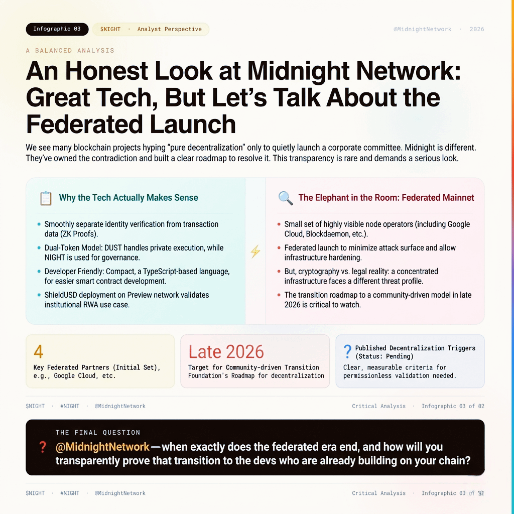 Quindi, @MidnightNetwork—quando esattamente finisce l'era federata, e come dimostrerai in modo trasparente quella transizione agli sviluppatori che stanno già costruendo sulla tua catena?