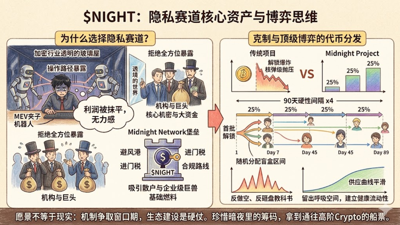 这就注定了 $NIGHT 绝对不是什么可有可无的奖励代币,它是隐私世界的进门税。在 @MidnightNetwork 构建的生态里,不管是进行复杂的零知识证明,还是运行那些需要严密保护商业机密的去中心化应用,每一次交互都绕不开这个核心资产。相比于那些老牌的隐私项目,它走的是一条极其老辣的合规隐私路线。这意味着它不仅能吸引像我们这样渴望保护交易策略的散户,更能吃下那些对合规有硬性要求的企业级巨兽。当这些巨鳄入场时,他们不是来炒币的,他们是来消耗基础燃料的。到那时,你手里握着的 NIGHT,其实就是未来整个隐私算力网络的调度权