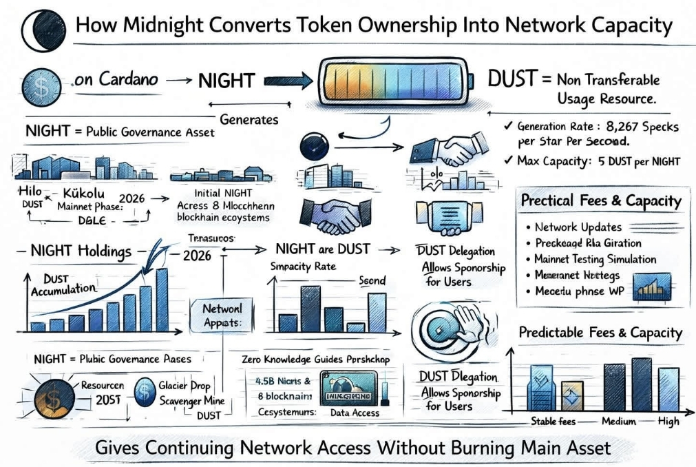 What I noticed first wasn’t just price. Midnight’s official token page makes it clear that NIGHT is the public governance token, while holding it generates DUST, a shielded and non-transferable resource used for transaction fees and smart contract execution.