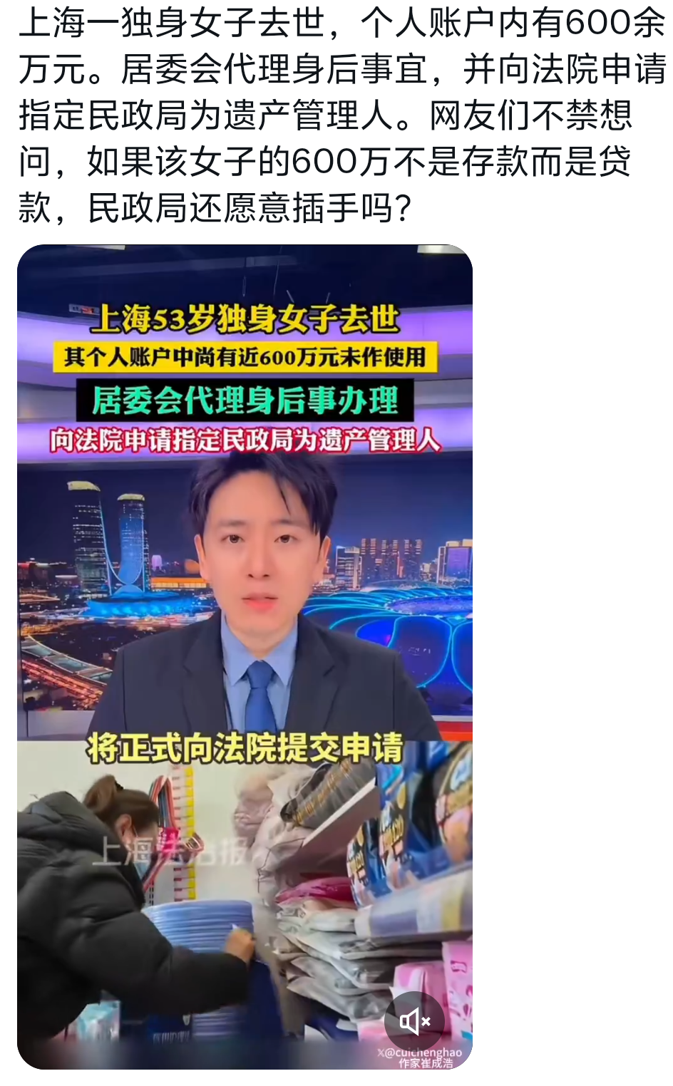 Una donna single di 53 anni a Shanghai è deceduta, lasciando quasi 6 milioni nel suo conto bancario. Il comitato di quartiere ha fatto avanti e indietro, alla fine ha fatto richiesta al tribunale per far sì che il dipartimento della previdenza sociale diventasse l'amministratore dell'eredità. Il risultato è stato che un commento geniale di un utente ha colpito dritto al cuore: “Se questi 6 milioni non fossero un deposito, ma un prestito, il dipartimento della previdenza sociale sarebbe ancora disposto a intervenire?”