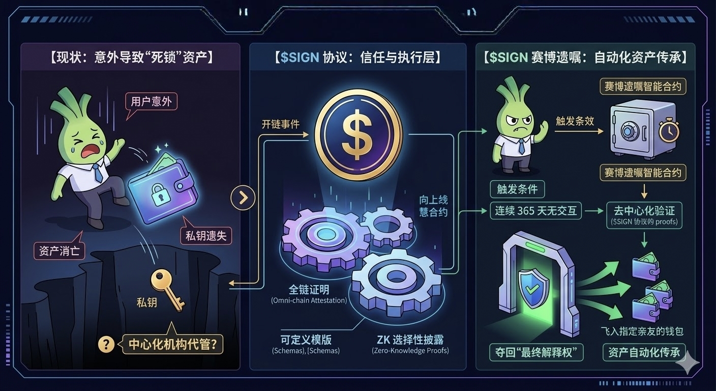 Pre-disponi un contratto intelligente e utilizza il meccanismo di verifica di Sign per impostare una condizione di attivazione per una 'multipla attestazione'. Ad esempio: se il mio indirizzo del portafoglio non ha avviato alcuna interazione per 365 giorni consecutivi e i tre amici che ho designato (o un nodo di oracle di identità decentralizzato) hanno emesso una prova crittografica 'questo utente è deceduto/scomparso' tramite Sign Protocol.