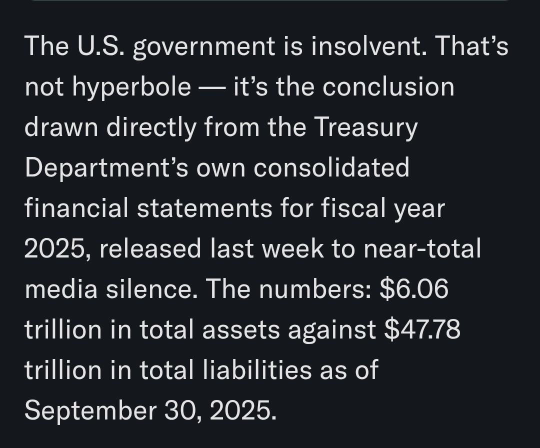 Il governo degli Stati Uniti è insolvente. Non è un'iperbole — è la conclusione tratta direttamente dai bilanci consolidati del Dipartimento del Tesoro per l'anno fiscale 2025, pubblicati la settimana scorsa quasi senza attenzione da parte dei media. I numeri: 6,06 trilioni di dollari in attivi totali contro 47,78 trilioni di dollari in passività totali al 30 settembre 2025.