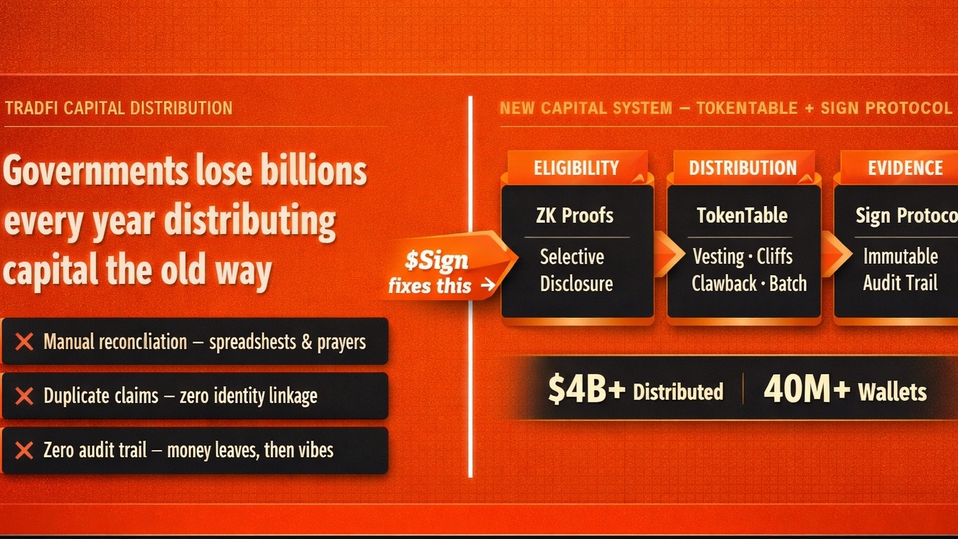 Il protocollo Sign ancorisce tutto - attestazioni di idoneità, manifesti di allocazione, riferimenti all'esecuzione, approvazioni di conformità, audit post-distribuzione tutto immutabile, interrogabile e verificabile e le regole sono versionate. Puoi letteralmente ripetere un audit e dimostrare esattamente quali regole erano in vigore al momento di una specifica distribuzione, che non è solo meglio di tradfi, è una categoria completamente diversa di responsabilità.