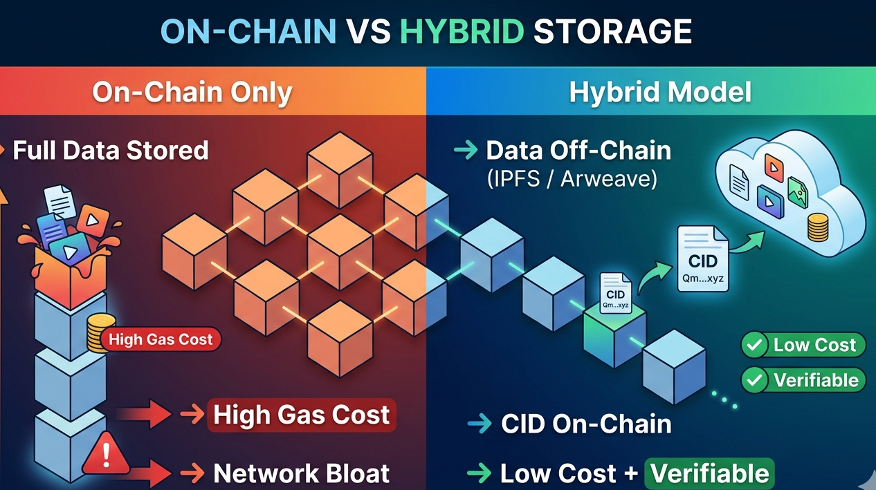 Invece di spingere set di dati completi on-chain, sposti le parti pesanti off-chain. Strati di storage come IPFS o Arweave gestiscono il bulk. Ciò che rimane on-chain è solo un riferimento. Un CID. Qualcosa di leggero, verificabile e economico.