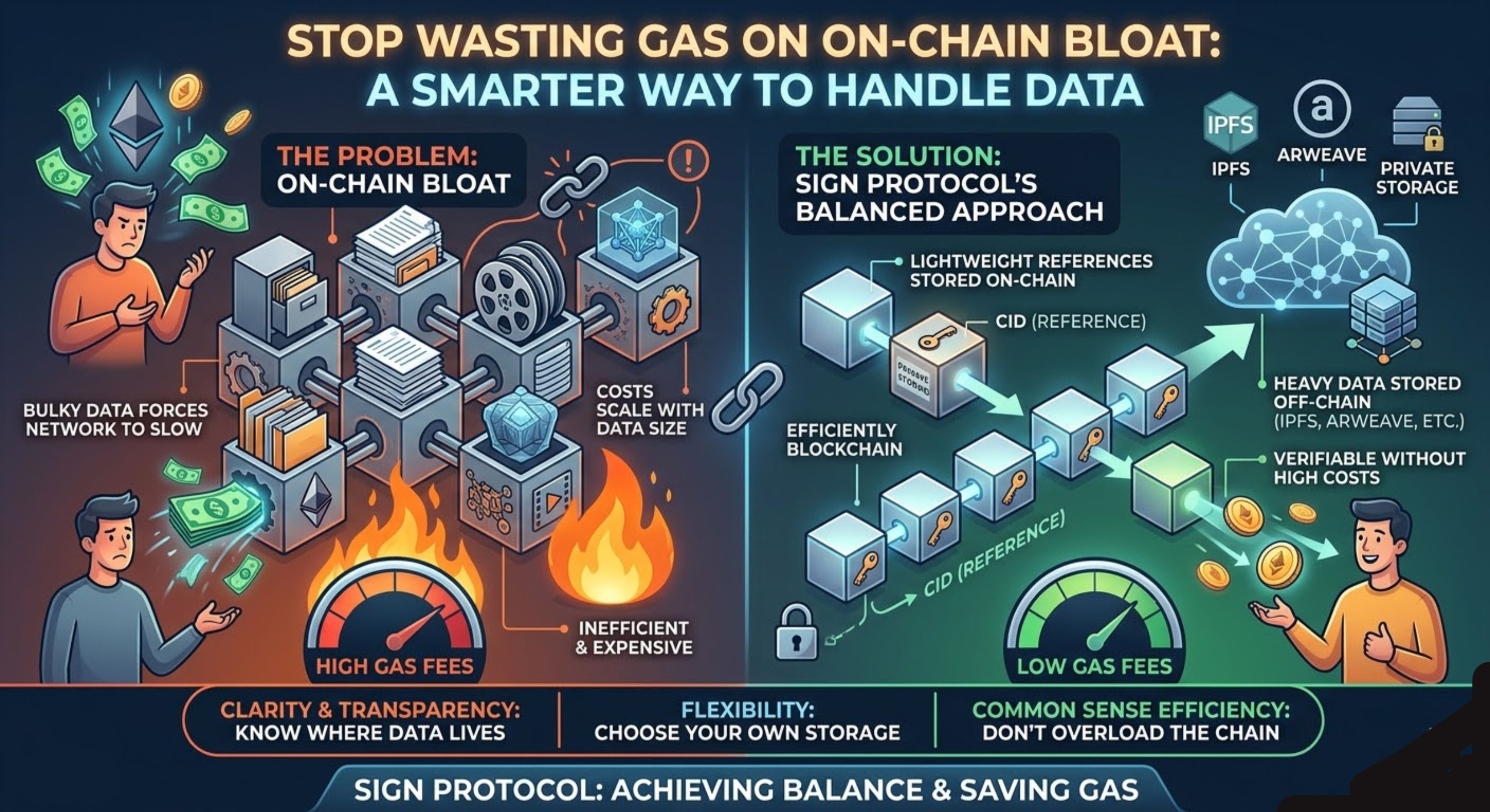 Instead of forcing everything on-chain, Sign Protocol takes a more practical route. The bulky data gets stored off-chain—on systems like IPFS or Arweave—while the blockchain only keeps a small reference, like a CID. That tiny piece is enough to verify everything, without burning through gas. It’s simple, efficient, and honestly just feels smarter.