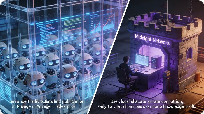 Midnight 用 Kachina 把合约切成公共状态与私有状态:敏感计算在本地私密完成,只把零知识证明发到链上验证。节点只认“真伪”,不问“细节”。