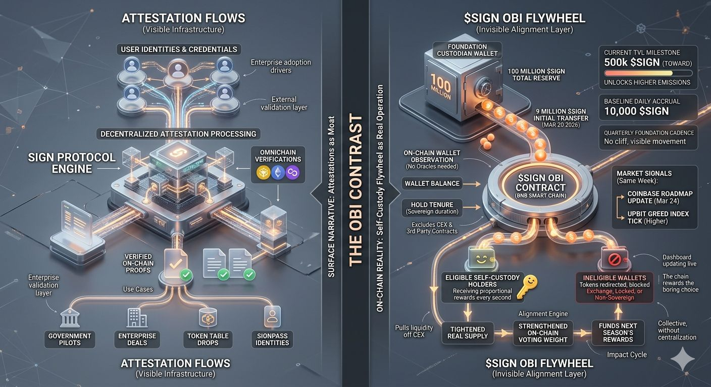 I sat there with my coffee going cold, wallet open on the side, and realized this wasn’t another staking gimmick layered on top of attestations. It was a deliberate pivot. The surface story everyone repeats is SIGN Protocol as the go-to for omnichain attestations—decentralized proofs that governments and apps can trust. Yet here, in real time, the OBI mechanic was doing something subtler: pulling liquidity off centralized exchanges by tying rewards directly to on-chain wallet balances and hold duration. I checked my own holdings right then, moved a small slice from a CEX just to test the dashboard refresh, and felt the shift. This wasn’t about flashy yields. It was about making true ownership the default expectation.