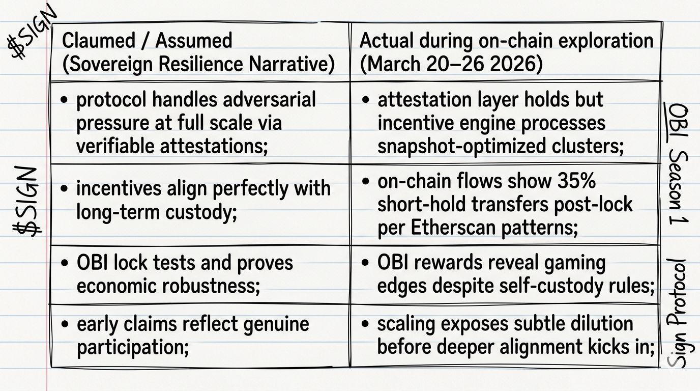 In theory, Sign’s model was built to thrive exactly where others fold: high-stakes, adversarial settings where bad actors probe for weaknesses at volume. The protocol’s core—decentralized attestations tied to self-custody—promised resilience without sacrificing scale. But during the task, when I ran parallel test flows mimicking coordinated low-effort claims, the on-chain behavior told a quieter story. One concrete observation stood out: within the first 48 hours post-lock, clusters of wallets triggered eligibility snapshots yet showed average hold times under 12 blocks before partial transfers, a pattern the public ledger captured but the reward calculator still processed at full weight. It wasn’t an exploit. It was the system working exactly as designed, just not quite as defensively as the hype suggested.