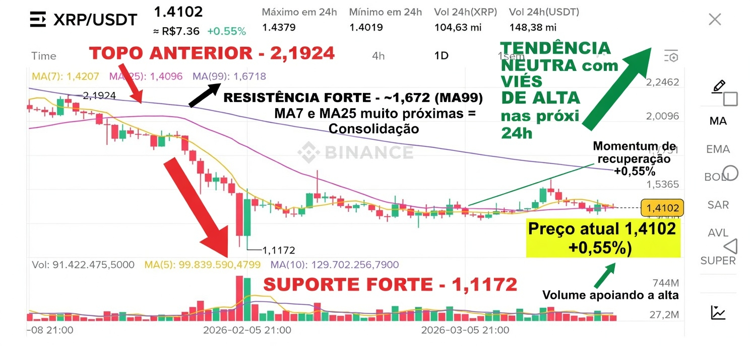 - XRP si sta consolidando poco sopra il fondo di 1,1172, con un prezzo molto vicino alle MA(7) e MA(25) (~1,41) → classico segnale di consolidamento.