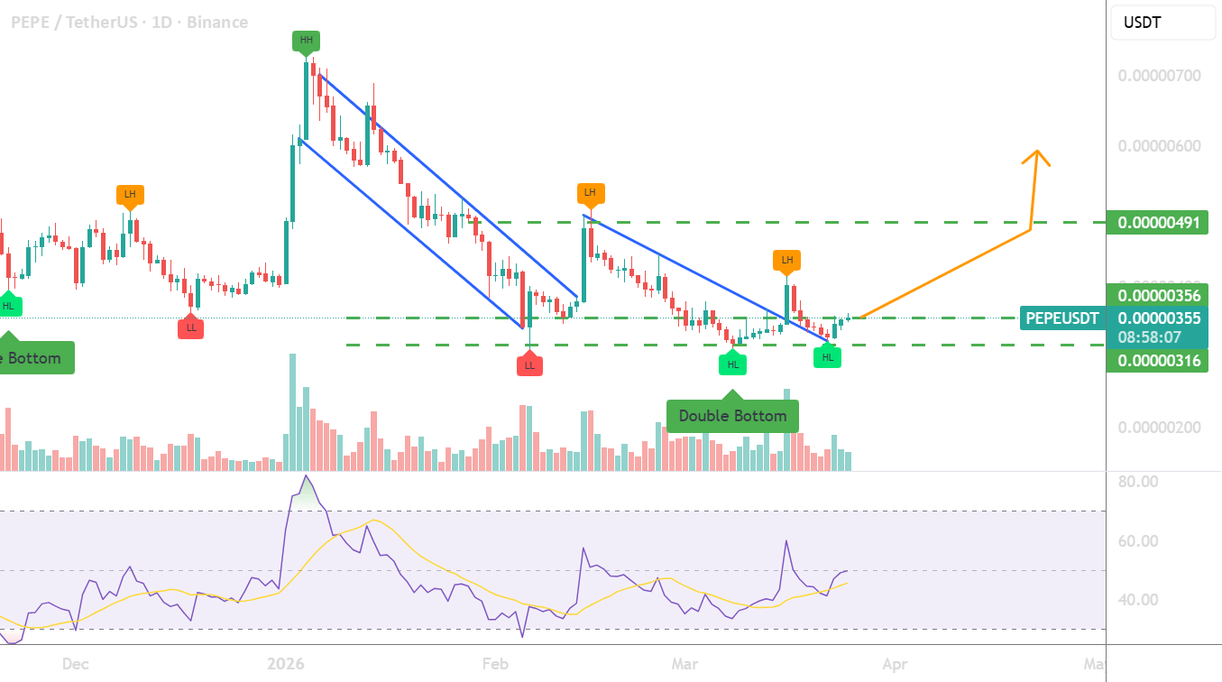 PEPE تشكل قاع مزدوج + إعداد عكس الاتجاه على الإطار الزمني اليومي.