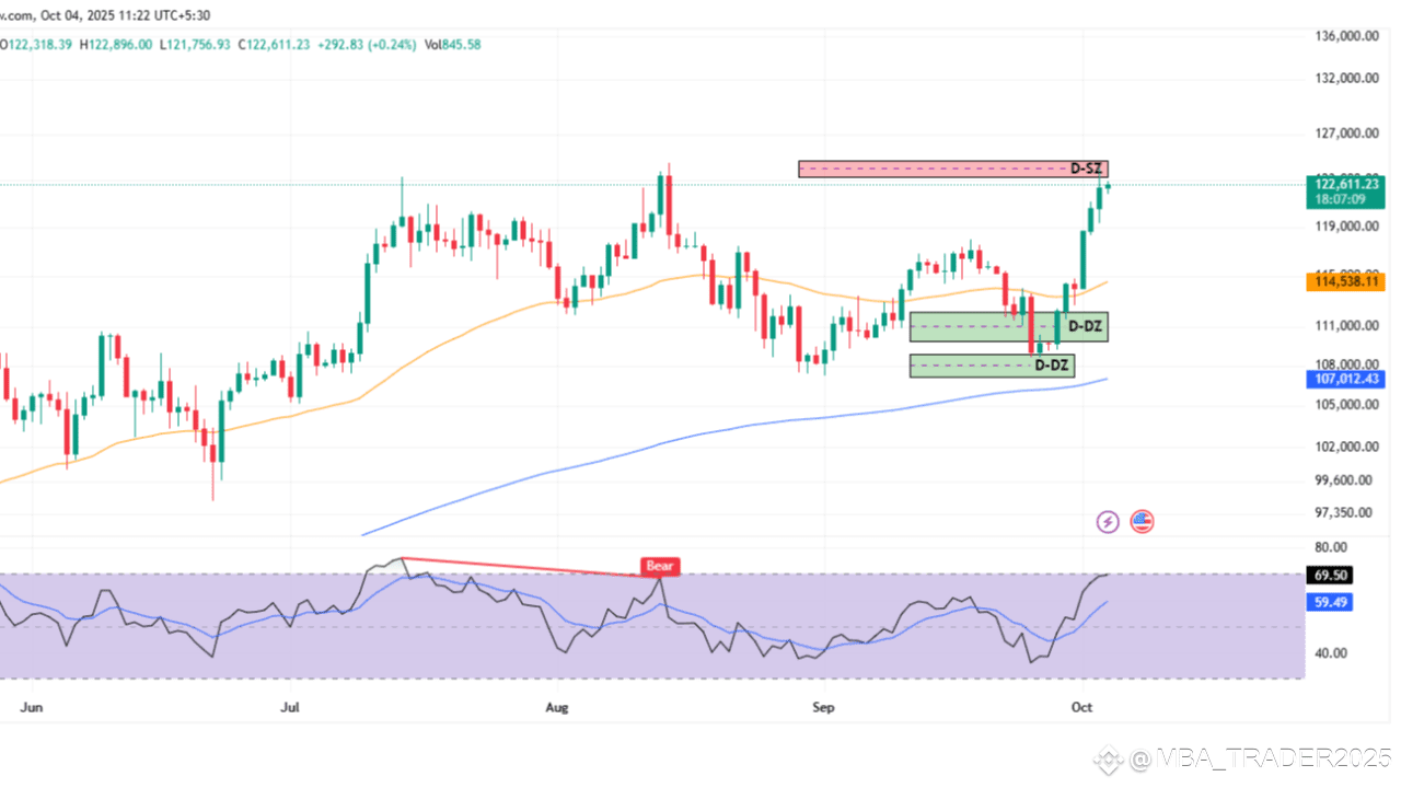 Contesto: Il prezzo è aumentato dalla domanda di 111.0k–112.0k fino al ripiano di offerta di 122.5k–123.0k; solo una chiusura giornaliera attraverso questo intervallo conferma un nuovo territorio verso 124.5k.