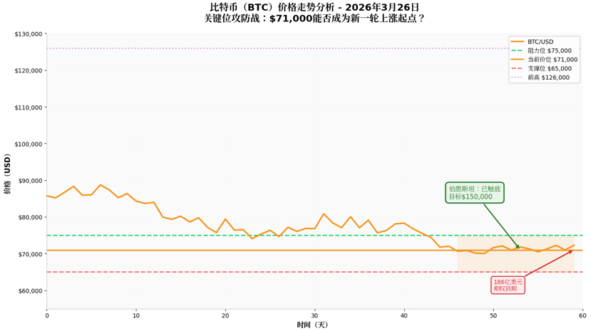 Il 26 marzo 2026, il mercato delle criptovalute mostra una fase di consolidamento. Il Bitcoin si aggira intorno ai 71000 dollari, l'analista di Bernstein Gautam Chughani afferma che ha "raggiunto il fondo" e ribadisce l'obiettivo di 150000 dollari entro la fine dell'anno; l'Ethereum viene scambiato intorno ai 2165 dollari, le riserve degli scambi hanno toccato un minimo storico dal 2016, con oltre un terzo dell'offerta bloccato in contratti di staking. Venerdì si avvicina la scadenza di opzioni Bitcoin del valore di 18,6 miliardi di dollari, che potrebbe diventare un catalizzatore chiave per superare la resistenza di 75000 dollari o per ritestare il supporto di 65000 dollari. La probabilità che la Federal Reserve mantenga i tassi invariati ad aprile è del 94,8%, l'ambiente macroeconomico di liquidità continua a presentarsi come "più alto e più duraturo".
