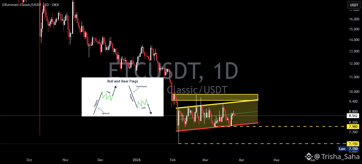 On the 1D timeframe, ETC/USDT remains in a clear downtrend after rejection from the upper zone (around $16–17). Following a sharp decline, price is now forming a narrow ascending channel, indicating a potential Bear Flag pattern.