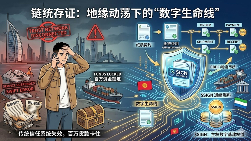 兄弟们,刚跟我在迪拜做跨境贸易的哥们通完电话,他那边银行系统因为局势升级直接停服了,国际结算通道全断。几百万美金的货款卡在中间行,急得他嘴上起泡。这已经不是第一次了,但这次他跟我说了一句让我后背发凉的话:“要是早用上你们圈里说的那套链上存证,我这钱早到账了。”说实话,我盯着手里SIGN的仓位,突然觉得这玩意儿比黄金还硬。这不是我在吹牛,是血淋淋的现实教育出来的认知。