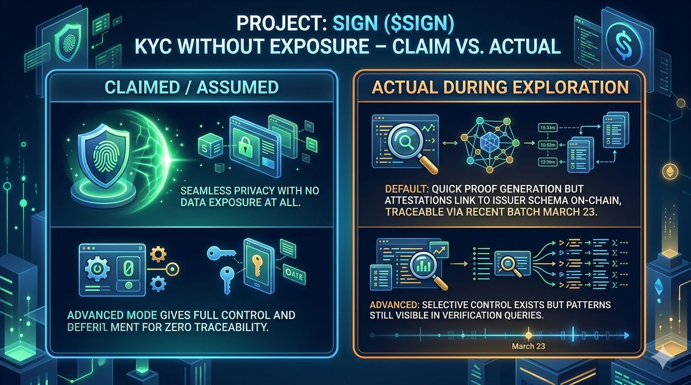 While wrapping up the CreatorPad task on Sign Protocol’s KYC Without Exposure angle well past midnight, one quiet contrast stopped me cold. I had expected the privacy mechanic to feel more absolute, the kind of zero-knowledge shield that erases footprints entirely. Instead Sign Protocol ($SIGN) #Sign @SignOfficial showed its attestation layer operating with a practical restraint that lingered in my notes. Default proofs generated fast, no documents uploaded, no central store holding raw data, yet the schema and attester details still anchored everything publicly enough to leave observable patterns if you were watching.