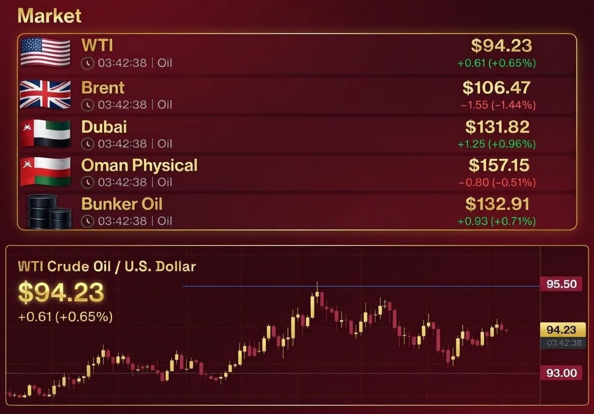 Cuando Omán liquida a $157,15 y Dubái a $131,82, mientras que el WTI se mantiene en $94,23, el mercado ya no cuenta una sola historia.