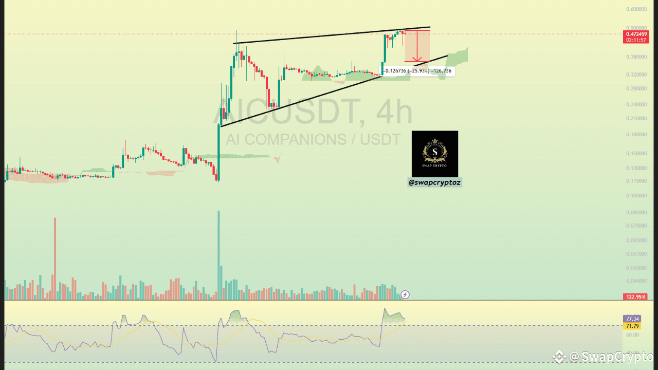 Il grafico AICUSDT sta formando un modello a cuneo rialzista. In termini semplici, il prezzo sta comprimendo verso l'alto in un angolo, ma sta esaurendo l'energia. Questa forma di solito suggerisce che la corsa sta per fallire e il prezzo probabilmente romperà e scenderà presto.