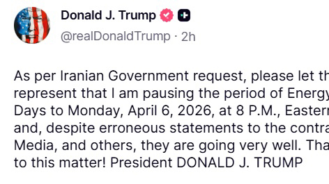 “Su richiesta del Governo dell'Iran, si prega di considerare questa dichiarazione come avviso che sto ritardando la distruzione delle strutture energetiche per 10 giorni, fino a lunedì 6 aprile 2026, alle 20:00 ora orientale. I negoziati sono in corso e, nonostante dichiarazioni inaccurate e fuorvianti da parte dei media di fake news e altri, stanno progredendo molto bene. Grazie per la vostra attenzione a questa questione! PRESIDENTE DONALD J. TRUMP”