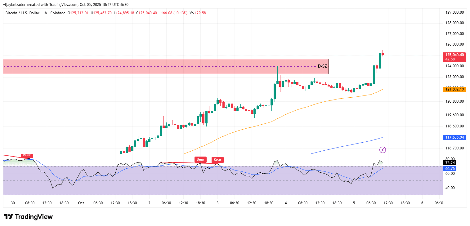 In sintesi: La tendenza rimane rialzista, ma il prezzo si trova a resistenza—o accettare sopra 125.5k–126.0k ed estendersi a 126.5k–127.2k, oppure aspettarsi una digestione verso 123.8k/122.6k dove l'RSI-50 rimbalza e la confluenza EMA offre ingressi di continuazione di qualità superiore.