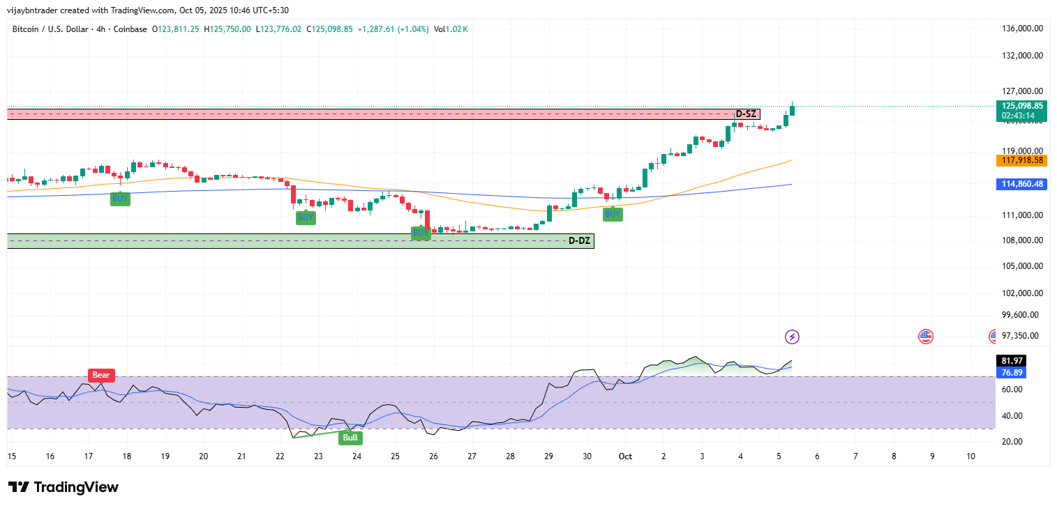 BTC si è esteso a 125.1k dopo aver superato 123.0k–123.8k e ora sta premendo l'offerta superiore giornaliera/4h; il momentum rimane rialzista su tutti i frame, ma il prossimo passo necessita di accettazione sopra 125.5k–126.0k alla chiusura, altrimenti ci si aspetta un ritracciamento controllato verso 123.8k → 122.6k → 121.9k dove le MA in aumento e il regime RSI-50 dovrebbero essere difesi nel trend.