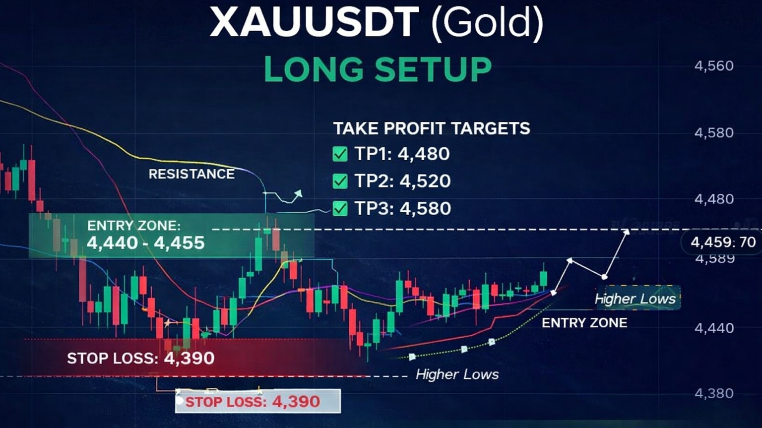 Dopo essere rimbalzato dalla zona di supporto a 4,355, il prezzo ha iniziato a formare minimi crescenti, indicando una crescente pressione d'acquisto. Il mercato sta ora tentando di costruire slancio per un breakout sopra il livello di resistenza a 4,480 💥