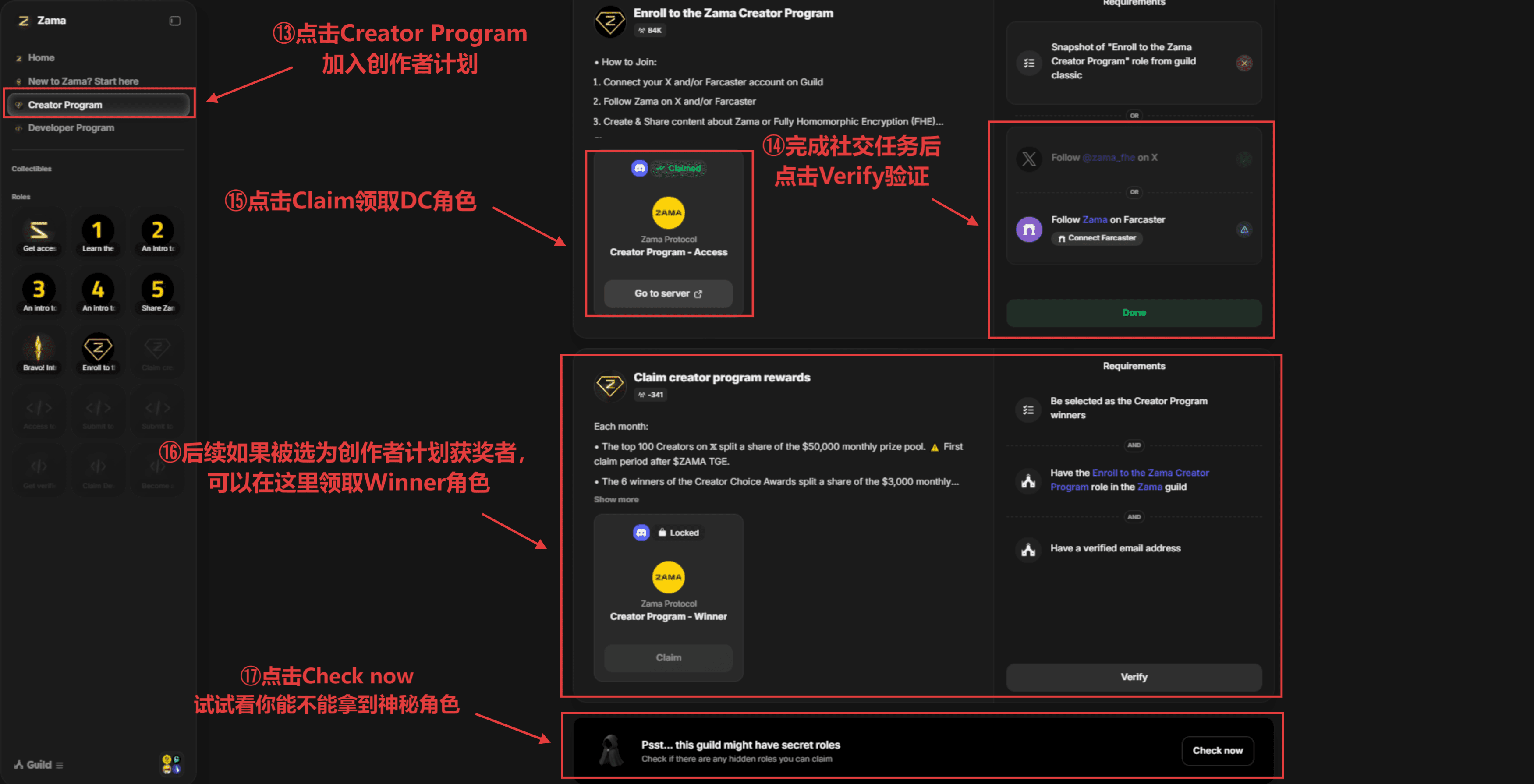 Collegati prima al tuo account X e/o Farcaster su Guild, segui @zama_fhe e poi crea e condividi contenuti relativi a Zama o FHE (ricorda che devi includere @zama_fhe o #ZamaCreatorProgram per essere tracciato e ricevere ricompense)