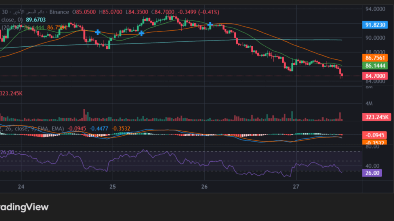 تنبيه: هذه الصفقة تعتمد على "صيد الارتداد" (Counter-trend trade). بما أن الاتجاه العام هابط، يفضل تأمين الصفقة برفع وقف الخسارة إلى سعر الدخول فور تحقيق الهدف الأول. السعر حالياً يحاول الاستقرار، وإذا فشل دعم $84.00 في الصمود، فقد نرى زيارة لمستويات $80.00.