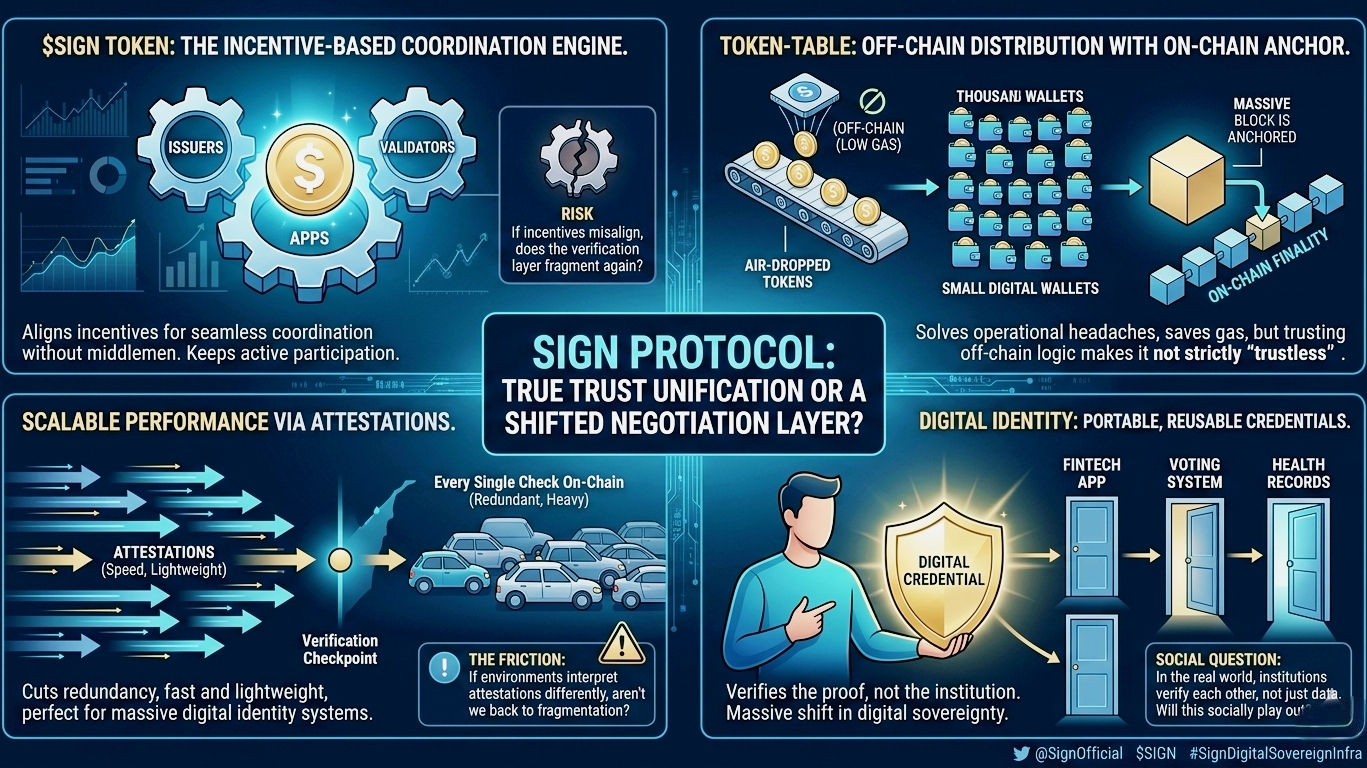 A prima vista, molte persone trattano $SIGN come il tuo standard utility o governance token. Ma guardando da vicino all'architettura, funziona molto di più come un motore di coordinamento. Si trova proprio tra emittenti, validatori e app, allineando perfettamente gli incentivi affinché tutto funzioni senza un intermediario. Non si tratta solo di pagare le spese di gas—si tratta di mantenere le persone attivamente partecipanti. Ma ecco cosa continua a darmi fastidio: se quegli incentivi dovessero mai diminuire o disallinearsi, il livello di verifica sopravvive, o la fiducia inizia semplicemente a frammentarsi di nuovo?