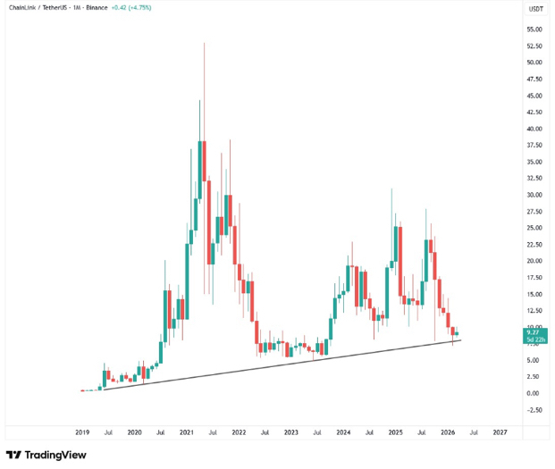 С точки зрения технического анализа LINK подходит к важному моменту. По данным TradingView, цена сейчас находится в ключевой зоне поддержки, которая сохраняется ещё с 2019 года. Если этот уровень удержится, структура рынка может измениться.
