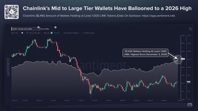 По данным Santiment, число кошельков с балансом от 1 000 LINK выросло до 25 420. Это максимум с 3 декабря 2025 года.