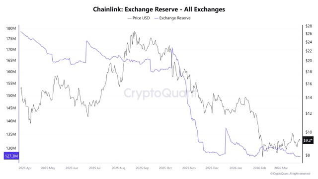 Дополнительно данные CryptoQuant показывают снижение резервов LINK на биржах, при том что цена остаётся в боковике ниже $10.