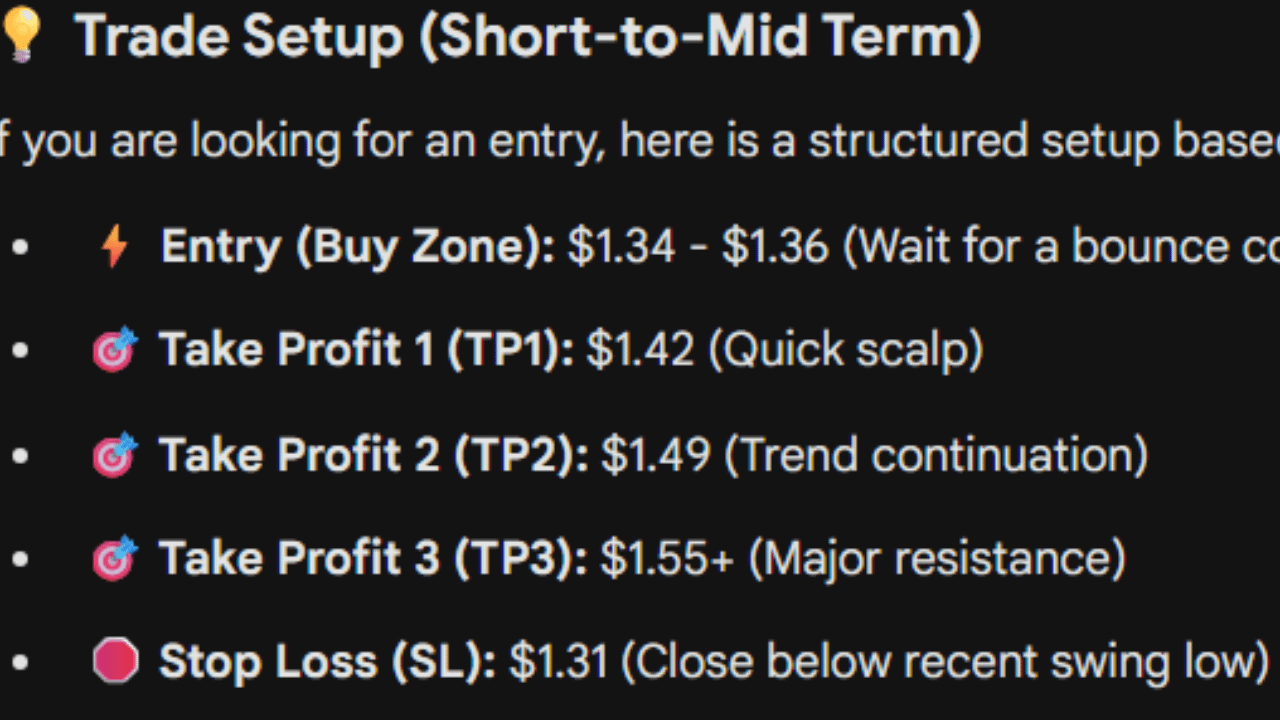 • ⚡ Entry (Buy Zone): $1.34 - $1.36 (Wait for a bounce confirmation on the 1H chart)