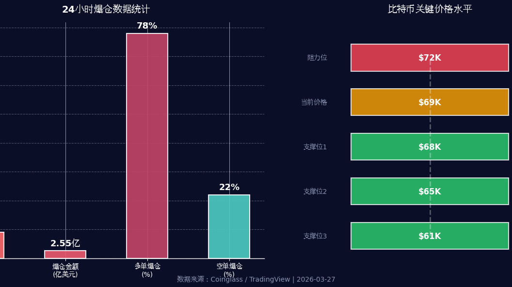 Il 27 marzo 2026, il mercato delle criptovalute ha continuato la tendenza al ribasso del giorno precedente, con il prezzo del Bitcoin che è sceso a 69.000 dollari, mentre Ethereum e le principali altcoin hanno subito pressioni simili. I rischi geopolitici in Medio Oriente continuano a fermentare insieme all'aspettativa di un inasprimento della politica monetaria negli Stati Uniti, causando un aumento del sentiment di avversione al rischio nel mercato. Negli ultimi 24 ore, oltre 90.000 persone sono state liquidate, con un importo di liquidazione che ha raggiunto 255 milioni di dollari. L'analisi tecnica mostra che il livello di supporto chiave per il Bitcoin è sotto pressione, e nel breve termine potrebbe mantenere un modello di consolidamento. Si consiglia agli investitori di controllare le posizioni e prestare attenzione all'evoluzione degli eventi macroeconomici.