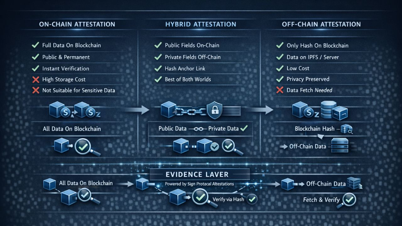 There are hybrid models in those cases when it does not have an obvious one or the other. Other elements of an attestation may require being publicly visible and readable immediately - a form of credential, an issuer identity, a time. Other areas of the same attestation may have to remain confidential - the particulars that prove eligibility, the personal identifiers which support the assertion. A hybrid solution places the on-chain components of the public fields and the off-chain components of the private fields, the on-chain component being a hash of the off-chain component. This provides the verifiers with the information of the people and does not reveal what is not supposed to be told.