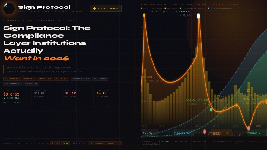The Middle East is probably one of the clearest examples of how this is being adopted in practice. This isn’t just experimentation anymore it’s moving into real infrastructure. Abu Dhabi’s Blockchain Center has expanded its use of Sign in digital identity and compliance systems, and in some cases, it’s becoming a required part of certain services.From what I’ve seen, Dubai is already testing this with tokenized real estate you can verify ownership and stay compliant without exposing sensitive details to everyone. Saudi Arabia is also moving in a similar direction, especially with Vision 2030, where Sign is being used in early-stage tokenized asset setups.On top of that, similar sandbox efforts are happening in Qatar and Bahrain, especially around cross-border payments and CBDC related verification.What’s important here is that these are regions that care deeply about both innovation and control.The fact that Sign fits into that environment says a lot about how it’s positioned.On the technical side, recent updates have made things much easier for developers. The March 2026 SDK update reduced integration friction quite a bit. Attestations can now be generated and verified in under 200 milliseconds on most supported chains, and cross-chain verification has become much more practical. For example, proving something created on Base across networks like Arbitrum, Solana, or BNB Chain is now far more efficient and doesn’t come with heavy costs.That improvement is already showing results. Over 40 protocols have integrated Sign in just the past couple of months.Some of these are confidential lending platforms, while others are focused on tokenized financial products that require ongoing compliance verification. One treasury platform alone is reportedly handling hundreds of millions in monthly volume using Sign-based attestations.From what I understand, the token side isn’t overly complicated. $SIGN is tied to governance, relayer staking, and accessing faster or higher-tier attestation services. Supply is still gradually unlocking, with vesting going on until 2027. Liquidity has been picking up a bit on Base and Arbitrum, but major exchange listings are still not fully there yet.Of course, there are still risks.Regulation is always evolving, and anything tied closely to compliance needs to stay adaptable. Even though Sign is designed to align with regulatory requirements, stricter global rules around privacy or attestations could slow down adoption.At the same time, competition exists, but not many solutions are combining speed, multi-chain compatibility, and institutional-grade compliance in a way that’s already being used in regulated environments like the UAE and Saudi Arabia.It’s not just the Middle East either. I’ve noticed some traction building in Europe with MiCA-related use cases, and in Asia, especially where tokenized securities are being explored. Even traditional institutions are starting to test this quietly, mostly trying to link their existing KYC and AML systems with on-chain activity without losing confidentiality.Going forward, I think visibility will matter a lot.If bigger exchange listings happen, that changes things. And at the same time, more teams building on top of it could slowly push adoption further.A number of projects have already received support to integrate these systems into their own infrastructure.At the end of the day, what makes Sign different is that it’s not trying to follow hype cycles. It’s focused on solving a very specific and very real problem how institutions can operate on-chain without giving up privacy or failing compliance requirements.And if tokenized assets, private credit, and regulated DeFi continue to grow the way they are now, this kind of infrastructure might end up being far more important than most people realize.