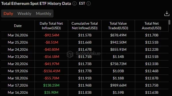 Secondo i dati di SoSoValue, i 10 fondi $ETH ETFs hanno visto 92,54 milioni di dollari in deflussi netti giovedì 26 marzo, principalmente guidati da ETHA di BlackRock con 140,24 milioni di dollari in deflussi. L'ETF Ethereum staked (ETHB) del gestore patrimoniale è riuscito a compensare una grande parte dei deflussi poiché ha attratto 96,81 milioni di dollari durante la giornata.